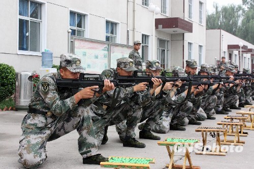 8月11日,河南焦作,中国第三批赴苏丹达尔富尔维和部队正在进行射击训练。该支维和部队,共三百一十五名官兵于8月5日在济南军区驻豫某部组建。目前,他们正在接受紧张的针对性、适应性教育训练。将于九月上旬出征苏丹达尔富尔维和。中新社发 王中举 摄