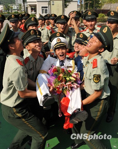 10月5日上午,北京国庆60周年庆典联合军乐团的31名驻粤武警军乐手载誉而归。 中新社发 陆建东 摄