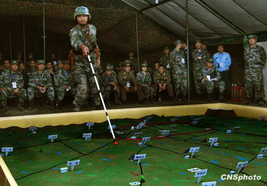 解放军济南军区“前锋-2009A”军事演习于10月21日17时在某合同战术训练基地打响,这次陆空军联合火力打击实兵实弹演习将持续20余个小时,当晚国防大学防务学院、空军指挥学院的外军学员,以及英国、以色列、土耳其、巴基斯坦等国军事观察员亲临现场观摩了后勤保障战斗准备、自行榴弹炮占领阵地、装甲车辆“摸黑”开进等战斗要素。中新社发 宋吉河 摄