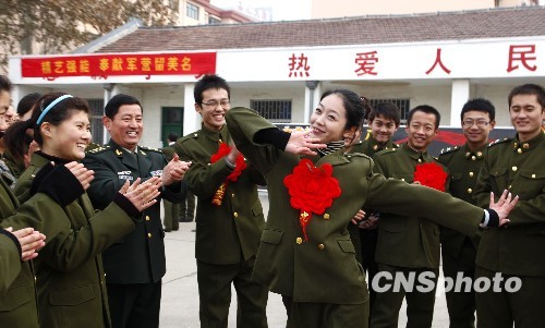 12月4日,济南军区某装甲师一级士官叶灵光荣退伍。作为部队战士业余演出队的一员,叶灵曾参加了北京奥运会开幕式大型舞蹈表演,服役期间她坚持用舞蹈展现军营风貌,把快乐带给基层官兵,被大家亲切地誉为“奥运女兵”。临别军营之际,她即兴为战友们表演舞蹈《放飞理想》。中新社发 毕华明 摄