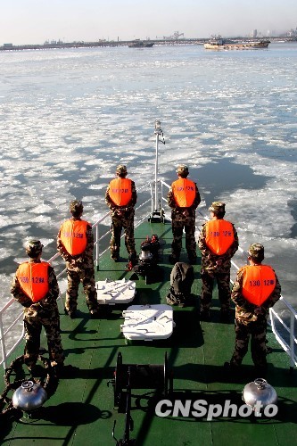 连日来,河北秦皇岛遭遇罕见的低温寒潮天气,持续的低温导致当地近海海域出现了多年不遇的海水结冰现象。为确保中国“电煤南运”海上大通道的畅通,河北海警支队开展了“电煤南运”专项护航行动。图为1月13日,河北海警官兵在秦皇岛港附近海域驾艇执勤。中新社发 王小雪 摄