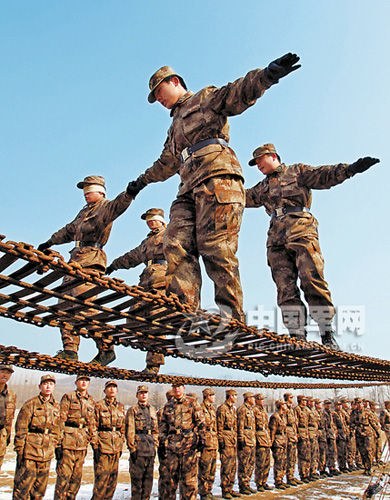 1月22日,在济南军区某装甲团新训课上,新兵营利用就便器材组织“信任之路”小游戏:新兵用救护三角巾蒙住双眼,拉住班长的手,小心翼翼走过危险地带。该团在新训工作中,针对新兵的生理和心理特点科学组训,提高了训练效率。毕华明 摄