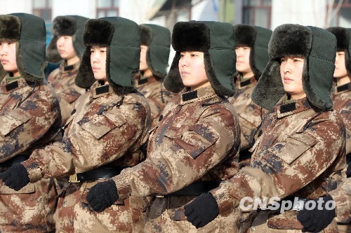 2月初,黑龙江省军区某新兵营的女兵们在训练中。2009年冬季征兵,大批有志女青年投身军营。中新社发 王忠言 摄