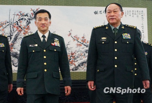 2月24日下午,国务委员兼国防部长梁光烈上将,在北京八一大楼会见来访的日本陆上自卫队参谋长火箱芳文上将,双方在友好的气氛中就各自关心的问题进行了交谈。中新社发 宋吉河 摄