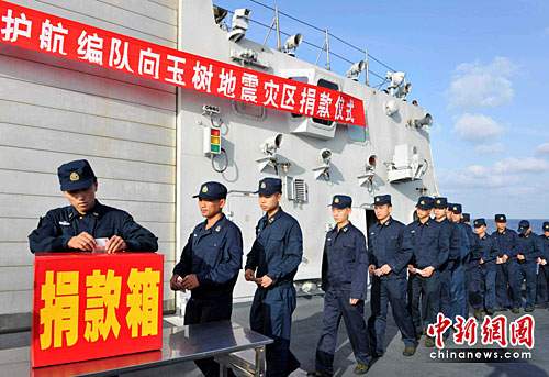 当地时间4月20日早晨6时30分,北京时间上午11时30分,正在亚丁湾、索马里海域执行第190批护航任务的中国海军第五批护航编队,在护航途中举行了“向玉树地震灾区捐款仪式”。中新社发 曹海华 摄