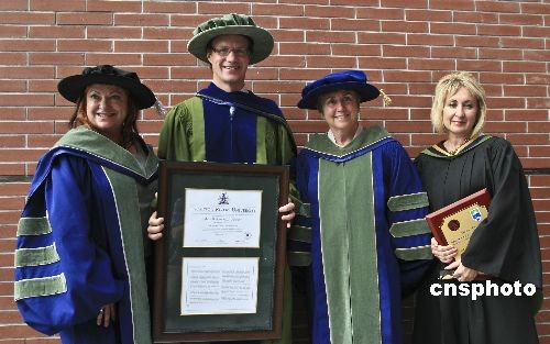 六月二十六日,中国最知名的加拿大人大山先生在天津出席“天津理工大学和汤姆逊大学学士毕业典礼”,并荣获由汤姆逊大学颁发的荣誉博士学位。这一荣誉学位肯定了大山先生通过国际教育形式为建立全球文化与经济的接轨所作出的贡献。汤姆逊大学(TRU)与天津理工大学合作的工商管理学士学位项目始于2002年。到目前为止,已有558名中国学生获得了中加这两所大学同时颁发的工商管理学士学位,这两所大学在商科教育领域的成功合作,已经成为中加合作办学的典范。中新社发 王磊 摄