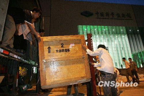 8月14日晚,云南省赠送给中国科技馆的三具恐龙化石被分装在15个大木箱中正式入驻与“鸟巢”毗邻的中国科技馆新馆。三具恐龙化石分别是号称中国乃至亚洲最大的恐龙化石,长达27米、高6.5米的阿纳川街龙,中国发掘的最古老恐龙类之一,有“中华第一龙”美誉的许氏禄丰龙,以及将首次在北京亮相的中国双脊龙。三具恐龙化石共有近1000块,其中最长的阿纳川街龙全身骨骼化石就达300多块。据介绍,恐龙的新家是中国科技馆新馆内条件设施最好的中央大厅,按照史前的生态环境及云南楚雄禄丰当地地貌“装修”,9月16日,三具恐龙将以一种“前所未有”的姿态与观众见面。中新社发 富田 摄