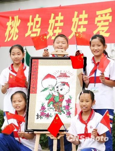 9月1日,一群苏州市桃坞中心小学“小桃娃”展示向祖国60华诞赶制的桃化坞木刻年画作品。当日,在苏州市平江区桃坞中心小学举行的主题为“桃坞娃娃爱祖国 我向国庆献寿礼”开学典礼上,几名该校“桃花坞木刻年画传习所的小桃娃在暑假期间精心创作与共同刻印的一幅高70厘米、宽40厘米的苏州桃花坞木刻年画精彩亮相,并将于国庆节前代表该校寄往北京中国少年先锋队工委,作为向祖国母亲60岁生日献上的一份祝寿礼。中新社发 王建中 摄
