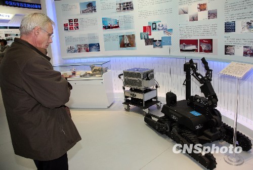 11月19日下午,一位外国驻华使馆官员驻足细看中国科学家研发成功的“灵蜥”系列反恐防暴机器人。当天,来自美、英、法、日等30多个国家驻华使馆的官员代表应邀参观中国科学院建院60周年展览。“灵蜥”系列反恐防暴机器人是展览中展出的一款备受瞩目的实物展品之一。据介绍,“灵蜥”是新型复合移动机构的系列反恐防暴机器人,其具有极强的地面适应能力,具有多种探测及作业功能,可满足应对突发事件之急需,功能与性能方面已达到国际同类产品的先进水平。中新社发 孙自法 摄