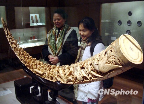 12月下旬,一件曾珍藏于北京圆明园内珍贵象牙在苏州博物馆展出。展出的象牙为非洲象牙,弧长204厘米,弦长177厘米,根部直径15厘米,整体透雕,刻有将士人物58个,集车、马、刀、枪、旌旗、松树、凤凰等纹饰造型,为水浒人物的一部分。中新社发 王建康 摄