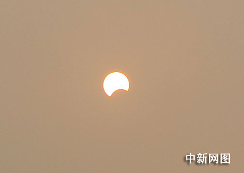 1月15日下午15时32分左右,一场“千年一遇”的日环食天文奇观如约光临中国,让天文爱好者们一饱眼福。图为重庆主城区初现日环食奇景。曹多然 摄