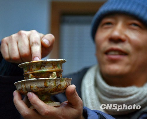 1月27日,河北省文物研究所透露,南水北调文物保护项目、位于河北内丘西关村和南中冯村的墓地、遗址发掘工作接近尾声。发掘完成的36座古墓,经鉴定为十六国、北朝、唐代、金代、明清等时期。其中,唐代墓葬出土的精美三彩炉、按剑武士俑、瓷杯、斗笠瓷碗具有重要的学术研究价值和历史意义。图为文物研究所工作人员展示唐代瓷器“三彩炉”。中新社发 翟羽佳 摄