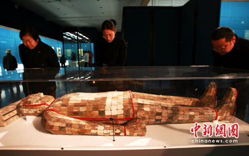 4月9日,曹操父亲的银缕玉衣在河南博物院亮相。随着曹操高陵的发现,国内外迅速掀起了曹操热,作为曹操的葬殓服银缕玉衣也受到民众的极度关注,曹操父亲的银缕玉衣分头部、上衣、手套、裤筒、鞋子5部分,由2464片大小不等的玉片和银丝编缀而成。中新社发 王中举 摄