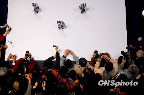 2010年4月9日,在第九届中国重庆高交会暨第五届中国国际军博会上,五个国产机器人随着音乐的节奏跳起舞来,吸引了众多参观展会的市民围观,大家纷纷拿起手中的相机或手机拍摄留念。中新社发 许康平 摄