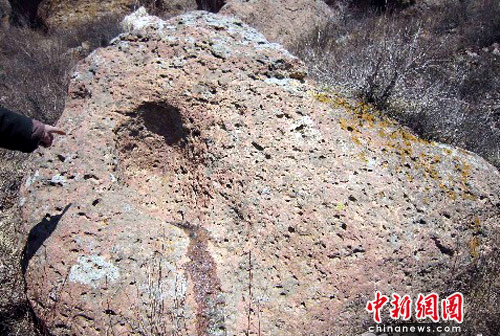 5月5日,河北张家口官方透露,该市桥西区东窑子镇菜市村附近山上发现3个大小不一、形态各异的石洞,最大的石洞洞口直径约3米,洞深约3米,洞壁平整,没有人工开凿的痕迹。据河北省地矿局工程师介绍,这些石洞和巨石是大约1亿年前火山爆发时形成,因喷发时岩浆物质不均匀,再加之在地表经过多年的高岭土化,大块的石头自然脱落,形成了石洞。中新社发 阴杰 摄