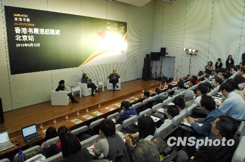 5月12日下午,2010年香港书展巡回路演北京站在国家图书馆举行,香港作家陈冠中、内地作家莫言和张悦然的对谈活动吸引京城众多读者前来参加。2010年香港书展将于7月21日至27日在香港会议展览中心举行。中新社发 侯宇 摄