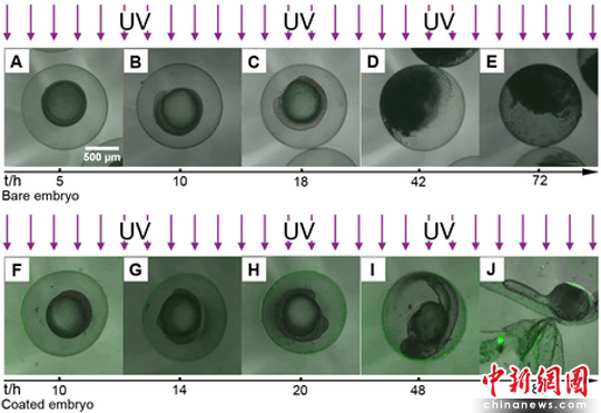 中新网杭州5月17日电(记者 江耘 实习生 陈佳 通讯员 周炜)浙江大学紫金港校区的化学实验室,一项模拟臭氧层空洞下的斑马鱼发育实验正在进行:在对照实验中,暴露在紫外辐射下的斑马鱼卵弱不禁风,全部停止了发育并死亡;而“穿上”课题组研发的“防护服”的斑马鱼卵则茁壮成长,顺利地完成了全部发育过程。