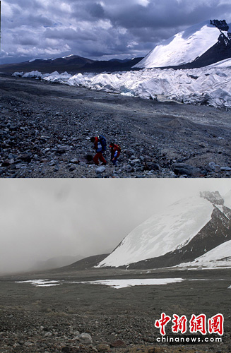 近日,“绿色江河”环保组织联合中科院寒区旱区环境与工程研究所,共同公布长江源冰川退缩最新数据。长江支流尕尔曲的源头岗加曲巴冰川在1969至2007年间,最大表面冰体退缩距离超过4000米,平均退缩距离超过2800米。图为岗加曲巴冰川1994年(上)与2010年(下)冰体照片对比。中新社发 杨欣 摄