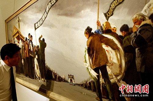 6月5日,由中国美术馆、中央美术学院、中国美术家协会、中国油画学会联合主办的“林岗、庞涛60年艺术回顾展”在北京中国美术馆开幕。伴随着新中国60年的历史进程,林岗和庞涛留下了他们共同走过的艺术足迹。展览通过两位艺坛伉俪不同时期的作品和创作风格的变化,反映了建国以来60年的社会变革与发展,中国艺术的变革与发展历程。两位艺术家60年的创作成果进行全方位的展示与回顾。通过作品分别述说两位艺术家无论是在动荡年代还是改革开放时期,始终保持着对生活的热爱,对艺术的真诚与自信。展出的作品给观众呈现出这两位艺坛伉俪与时代生活同舟共济,同时又不断追求自身艺术理想的杰作。图为 林岗、庞涛60年艺术回顾展作品。中新社发 钱兴强 摄