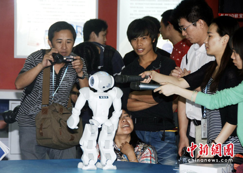 6月17日,一款会与人对话交流的机器人亮相福州海峡国际会展中心,吸引许多市民的眼球。中新社发 王东明 摄