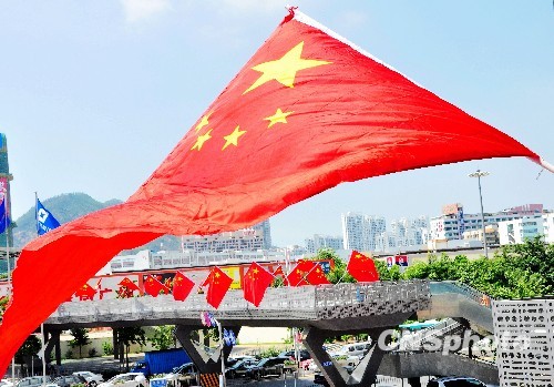 9月25日,深圳市南山区插满国旗,彰显出浓浓的节日气氛,让人精神振奋,市民朋友纷纷拿出手机、相机拍照留念。据南山区委宣传部新闻科科长黄健介绍,今年是该区连续四年来在全城悬挂国旗,主要是营造一种节日气氛,同时也是对广大市民的爱国主义教育。另据了解,经过四年的不断更新和改进,今年悬挂的6000面国旗可以抵抗低级别的台风。中新社发 吕雪良 摄