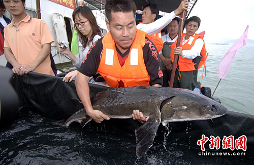 4月22日,世界地球日,厦门在九龙江鸡屿海域放流108尾有“鱼类活化石”之称的中华鲟。其中四只在海洋公园保育基金赞助下,首度配上“卫星追踪信标”,相关专家表示,这将是中华鲟研究及保育的一大突破,将开展有效保育中华鲟新的一页。中新社发 王东明 摄