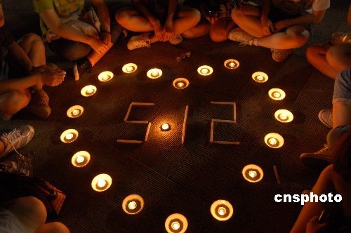 5月12日,四川汶川“5·12”大地震一周年纪念日,当晚,广西壮族自治区首府南宁的许多年轻人、甚至一些小学生自发在南宁民族广场举行烛光追悼活动,他们纷纷用点燃的蜡烛组成心形,悼念地震中的遇难者,并为灾区人民祈福、捐款。据悉,当天,中国各地的年轻人都用类似的方式悼念“5·12”地震遇难者。中新社发 刘万强 摄