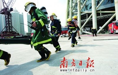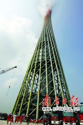 昨日(12日)上午9时30分,消防警报响彻珠江两岸,30台消防车呼啸着驶向广州新地标——高达610米的广州新电视塔。世界最高电视塔“失火”,上千工人紧急疏散,数十人被困火场。今年5月12日是全国首个“防灾减灾日”,为检验超高层建筑火灾应急处置和省城消防灭火救援能力,省减灾委员会办公室、省公安厅于当日上午在广州新电视塔举行超高层建筑灭火救援演习。