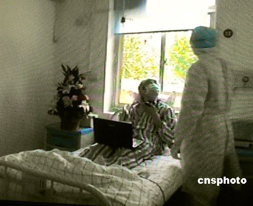 五月十三日中午,在山东省城济南市传染病医院接受治疗的输入性甲型H1N1流感疑似患者吕某某目前身体、精神各情况已基本恢复。疑似患者吕某某在十一日晚刚从济南火车站下车时体温一度高达三十八点九摄氏度。经过济南市传染病医院的医护治疗,体温已降至三十六点七摄氏度。图为记者从医院监控系统的电视屏幕上拍到的患者正在与医生交谈。中新社发 张璐 摄