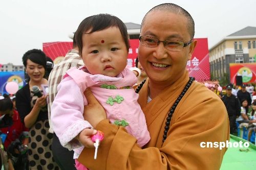 5月13日,“祝福明天——四川什邡地震罗汉娃生日抓周会”在四川什邡市北京小学举行。去年汶川大地震时,在什邡罗汉寺降生的108名婴儿,齐聚出生地庆祝周岁生日,并参加传统的抓周仪式。2008年四川地震将什邡市妇幼保健院大楼震成危房,千年古刹罗汉寺打破禁忌收留产妇和孕妇。此后的3个月中,共有108婴儿在此降生,被人们称为“罗汉娃”。“抓周”是在孩子周岁的时候举行的预测前途和性情的仪式,带有家庭游戏性质的民间习俗。中新社发 富田 摄