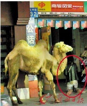 13日下午1时许,一名青年男子拉着一头骆驼,沿着广州丰乐路行乞。男子在每一家店铺前停下,甚至下跪不起(见图红圈所示),只为收取各家各户5角至1元的“打发费”。男子年约二三十岁,大热天里仍穿着长袖深色衣装,全身发出霉味。被他拉着招摇过市的是一头双峰骆驼,高近两米,显得很温顺。