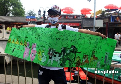 5月16日,在全民抵御H1N1流感的时候,北京的几位年轻网友设计并印制主题T恤衫,在海报上签名,以乐观的精神面貌,来增强人们的信心,并向过往游客赠送100个口罩。白色的T恤衫上印有,一个微笑的猪头像、撅嘴的人模样头像和“人有病,猪没病!”的字。青年网友们通过这样的方式,向大家传达抵抗疾病的决心。中新社发 老罗 摄