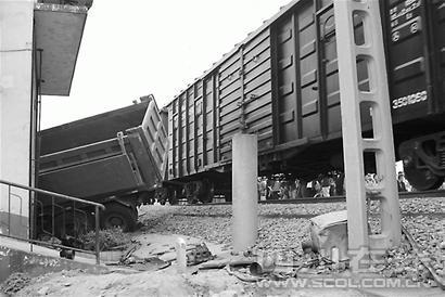 昨(15)日凌晨5时过,一辆出城货车途经金牛区老沙西线西环线兴盛铁路道口时,与左边飞驰而来的火车相撞,货车驾驶员当场死亡。是否由于当晚道口值班人员失职,造成道路两旁的栏杆没有放下来,成为死者家属质疑的主要焦点。