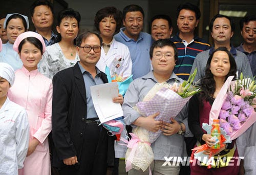 5月17日17日16时,经过卫生部、四川省、成都市的医疗专家组科学有效和精心细致的治疗,中国内地首例甲型H1N1流感患者包某某治愈出院。图为内地首例甲型H1N1流感患者包某某(前右二)和女友(前右一)父亲(前右三)与医务工作者合影留念。