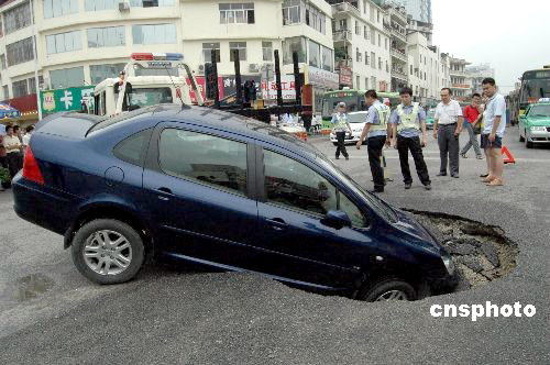 5月18日中午,广西南宁市一辆小轿车在驶过东葛园湖路口时,道路突然塌陷,小车一头栽进大洞中,幸司机无大碍。