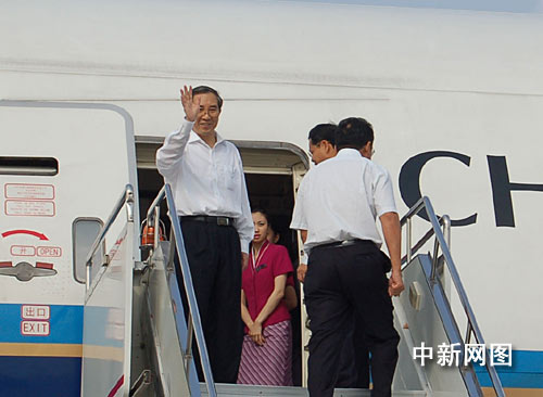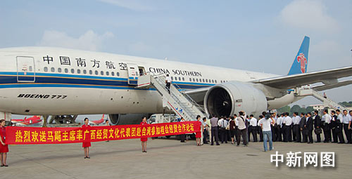 5月21日上午,广西壮族自治区主席马飚率领广西经贸文化代表团乘坐包机从广西南宁机场起飞,开始飞赴台湾,广西由此成为中国大陆各省、自治区、直辖市中第一个由省长级官员率团赴台进行经贸文化交流的省份,此行也成为海峡两岸交流史上的新突破。 马飚率团此行赴台是参加“两岸产业高峰会议——2009年桂台经贸合作论坛”,广西经贸文化代表团人数多达1000余人,这也是大陆赴台人数最多的参访团。刘万强 摄