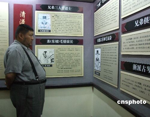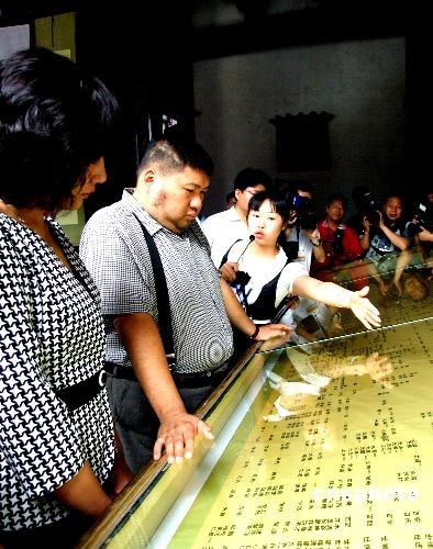 5月22日,毛泽东嫡孙、中国人民解放军军事科学院战争理论和战略研究部副部长毛新宇来到衢江之畔寻根,在导游的解说下,阅览江南毛氏家谱。根据专家考证,浙江省江山市的清漾村既是江南毛氏发祥地,也是毛泽东家族的祖居地。中新社发 赵晔娇 摄