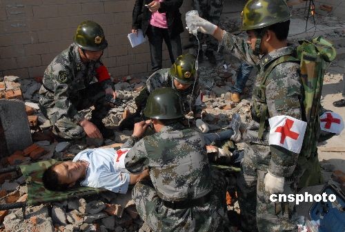 5月22日,中国地震局、省政府应急办、省地震局派员来扬,观摩华东五省一市地震应急联动在扬州市举行的地震应急协同演练。中新社发 尹德勤 摄