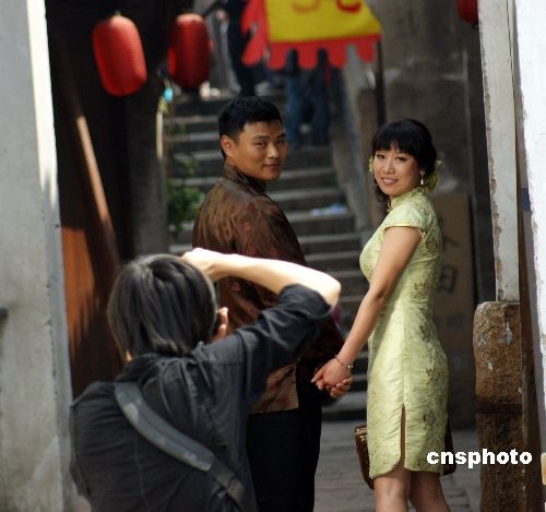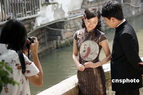 2009年5月24日,市民正在苏州山塘街拍摄古典写真照。苏州市千年“七里山塘”古色古香的街坊、“小桥、流水、人家”的江南水乡风貌在吸引许多中外游客纷至沓来的同时,更成为不少年轻人及当地影楼拍摄婚纱古装写真照的“天然摄影棚”。 中新社发 李俊锋 摄