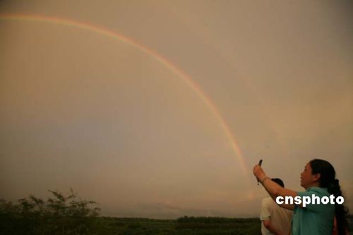 5月26日傍晚,在海南岛西线高速公路东方市板桥路段东侧天空中,出现巨型双层彩虹,引得人们纷纷拿出手机拍照。中新社发 杨旭 摄