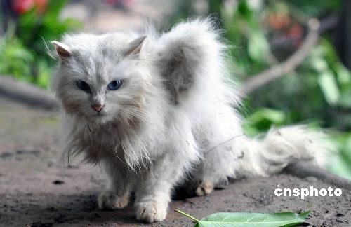 5月27日,记者在重庆市九龙坡区玉清寺一居民楼前看到,一只1岁大的白猫其背部两侧长出了两个约10厘长、毛茸茸的“翅膀”,活像天使。中新社发 银雪 摄