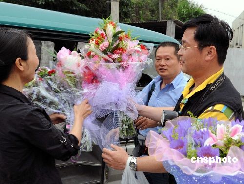 5月27日傍晚,在福州定点场所解除医学观察后,两名福建省首例输入性甲型H1N1流感确诊患儿同机接触者接受亲友(左一)赠送的鲜花。当日,福建省卫生厅在其网站上发布福建省甲型H1N1流感防控信息通报,截止5月26日24:00,卫生部通报福建省首例输入性甲型H1N1流感确诊患儿病情进一步好转,无咳嗽及流涕,无并发症,精神状态良好,体温正常,已连续3天体温低于37℃。根据专家组的意见,该患儿同机的30名在闽密切接触者隔离医学观察期限为5月27日20时。届时密切接触者如无特殊情况,即按期解除医学观察。患儿亲属及就诊过程中的8名密切接触者将按其与患儿脱离接触的时间起算,隔离满7日后,陆续解除医学观察。中新社发 刘可耕 摄