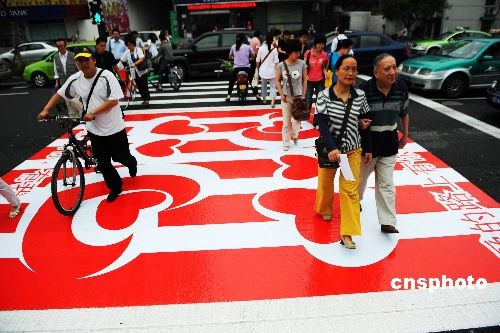 日前,为引导市民文明出行,让车辆能减速让行,在杭州的马路上出现了一种特殊的斑马线,这一条条宽约2米斑马线红白相间十几颗大大小小的爱心遍布其中,上面还写着一句“爱的宣言”:爱的路上有你,有我。图为市民走在杭州环城西路上的爱心斑马线上。中新社发 张洁 摄