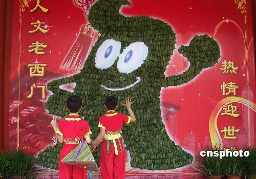 5月28日,上海老西门街道居民用2010个粽子齐心制作的“粽子海宝”亮相在文庙里,不仅营造着端午的文化气息还表达了迎接世博会的心愿。中新社发 周东潮 摄