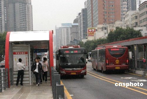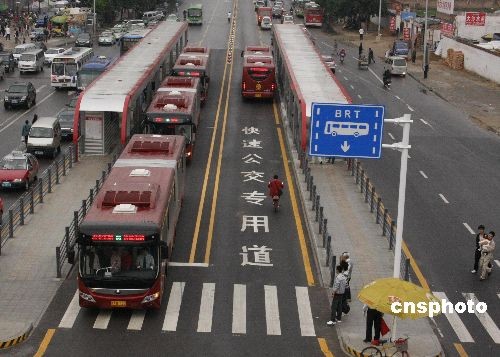 5月28日,新开通的快速公交行驶在专用车道上。当天,郑州快速公交(BRT)线路开通运行。该线路由1条30公里的主线和8条支线组成,运营车辆共计220余台,设站台38对,平均站距800米,全程采用封闭式中央专用车道。郑州快速公交首期建设项目不仅是全省开通的首条快速公交线路,也是目前全国在城市中心环线上开通的首条快速公交线路。中新社发 王中举 摄