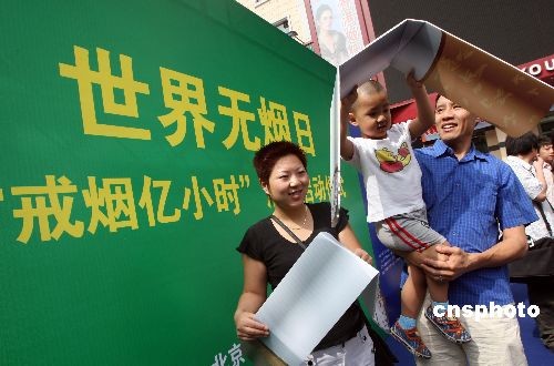 5月29日,一个家庭在北京王府井大街将香烟模型撅断,这是由北京市爱卫会主办的世界无烟日暨“戒烟亿小时”公益活动现场。该活动发出“戒烟一小时,健康亿人行”的戒烟口号,号召“世界无烟日”(5月31日)当天17点31分至18点31分之间戒烟一小时。据悉,中国是世界上烟草生产和消费第一大国,目前约有3.5亿吸烟者,并且还在以每年300万的速度增长,控烟形势极为严峻。中新社发 张宇 摄