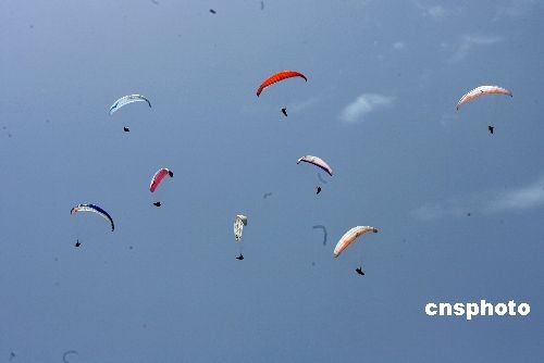 5月29日上午,近百顶滑翔伞在河南林州争奇斗艳,蔚为壮观。当日,2009滑翔伞世界杯热身赛暨全国滑翔伞优秀选手赛在河南安阳林虑山国际滑翔基地正式开赛,来自俄罗斯、法国、德国、日本等15个国家和地区的滑翔界“明星大腕”与其他选手一道进行角逐。