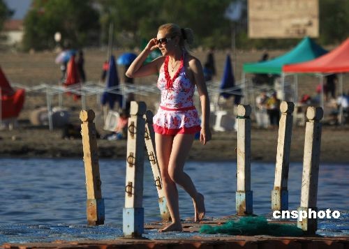 5月29日,一位俄罗斯美女身着泳装在被誉为新疆“夏威夷”的金沙滩景区,准备下水游泳。进入夏季,中国最大内陆淡水湖新疆博斯腾湖沿岸十余个旅游风景区陆续迎来游客,各景区积极筹备准备迎接旅游高峰。中新社发 刘新 摄
