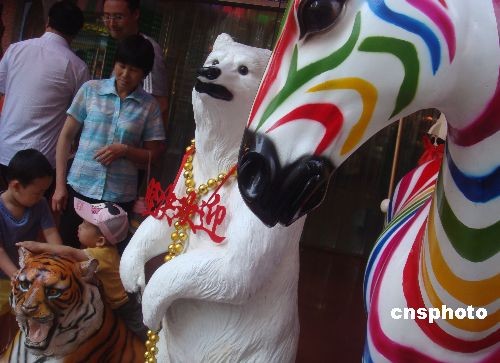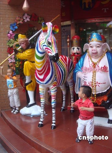 六一儿童节来临,北京一些商场特意在门前摆放中外神话故事卡通人物和玩具,吸引了孩子就招来了父母老人们的消费群体。中新社发 贾国荣 摄