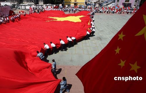 5月31日,北京七一小学举行特别队日庆祝六一儿童节,参与活动的师生在操场上共同展开了5000平米的巨幅国旗。据了解,巨幅国旗尺寸为88.88米×59.60米,重量约800斤,是中国面积最大的国旗。这面国旗是2008年中国移动举办的“展巨幅国旗,为奥运加油”活动的主角,在三亚见证过奥运火炬国内首站传递,在刚刚过去的纪念5·12汶川地震一周年之际曾被北川中学全体师生托起。当日,应《国家》主创成龙、刘媛媛等人邀请,四川青川县营盘乡乐元村小学7名学生参加了这一活动,并与七一小学结为手拉手友好学校,震区孩子将得到更多温暖和关爱。